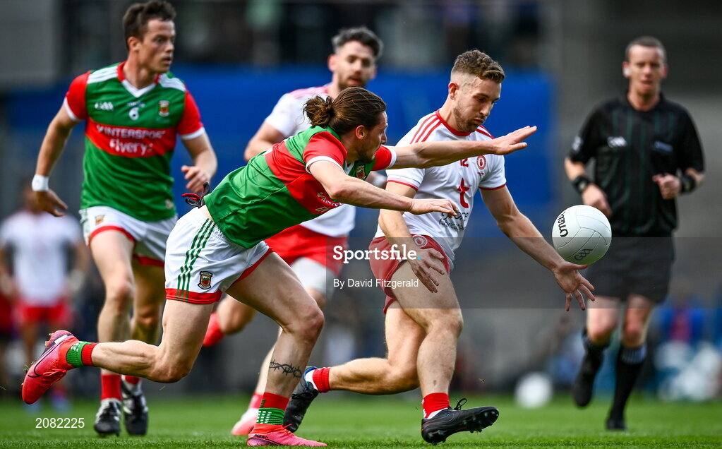 11 September 2021; Niall Sludden of Tyrone in action against Pádraig O'Hora of Mayo during the GAA Football All-Ireland Senior Championship Final match between Mayo and Tyrone at Croke Park in Dublin. Photo by David Fitzgerald/Sportsfile