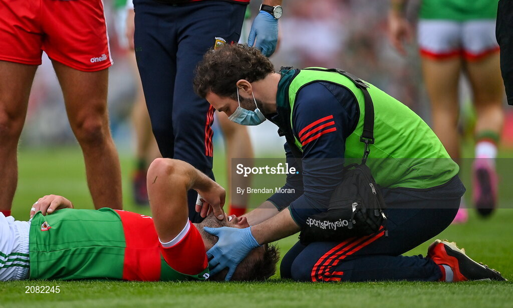 11 September 2021; Aidan O'Shea of Mayo receives medical attention during the GAA Football All-Ireland Senior Championship Final match between Mayo and Tyrone at Croke Park in Dublin. Photo by Brendan Moran/Sportsfile