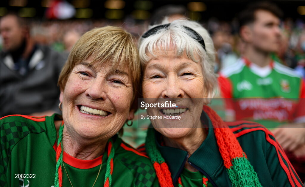 11 September 2021; Mayo supporters Imelda Vesey, left, and Carmel Gallagher, from Achill Island during the GAA Football All-Ireland Senior Championship Final match between Mayo and Tyrone at Croke Park in Dublin. Photo by Stephen McCarthy/Sportsfile