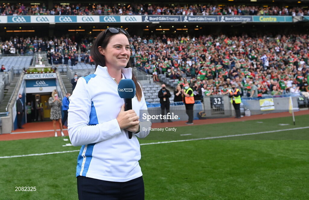 11 September 2021; Solheim Cup winner Leona Maguire is introduced to the crowd at half-time of the GAA Football All-Ireland Senior Championship Final match between Mayo and Tyrone at Croke Park in Dublin. Photo by Ramsey Cardy/Sportsfile