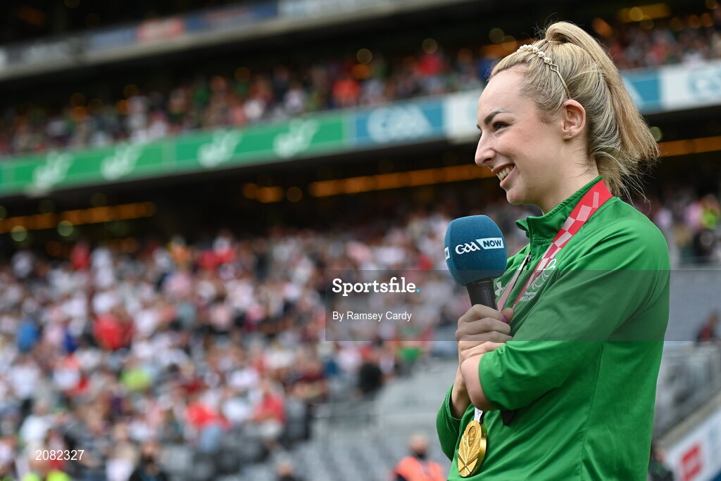 11 September 2021; Tokyo Paralympic Gold medallist Ellen Keane is introduced to the crowd at half-time of the GAA Football All-Ireland Senior Championship Final match between Mayo and Tyrone at Croke Park in Dublin. Photo by Ramsey Cardy/Sportsfile