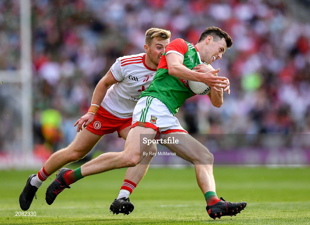 11 September 2021; Diarmuid O'Connor of Mayo in action against Michael O’Neill of Tyrone during the GAA Football All-Ireland Senior Championship Final match between Mayo and Tyrone at Croke Park in Dublin. Photo by Ray McManus/Sportsfile