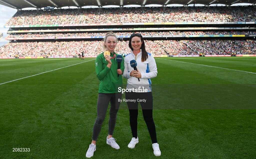 11 September 2021; Tokyo Paralympic Gold medallist Ellen Keane, left, and Solheim Cup winner Leona Maguire are introduced to the crowd at half-time of the GAA Football All-Ireland Senior Championship Final match between Mayo and Tyrone at Croke Park in Dublin. Photo by Ramsey Cardy/Sportsfile