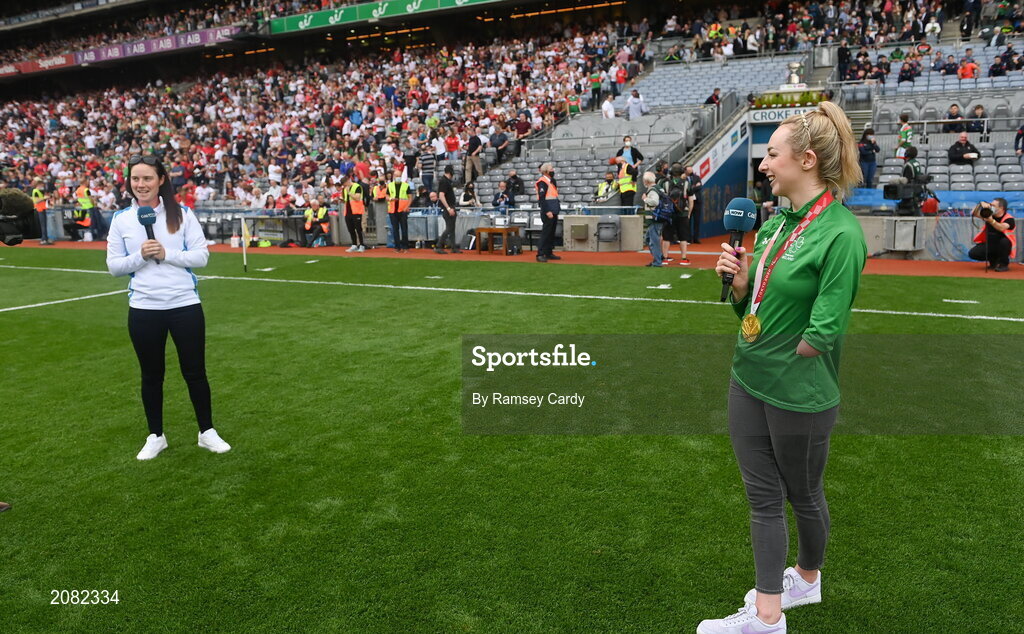11 September 2021; Tokyo Paralympic Gold medallist Ellen Keane, right, and Solheim Cup winner Leona Maguire are introduced to the crowd at half-time of the GAA Football All-Ireland Senior Championship Final match between Mayo and Tyrone at Croke Park in Dublin. Photo by Ramsey Cardy/Sportsfile