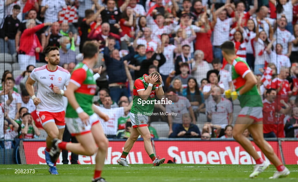 11 September 2021; Ryan O'Donoghue of Mayo reacts after missing a penalty during the GAA Football All-Ireland Senior Championship Final match between Mayo and Tyrone at Croke Park in Dublin. Photo by Stephen McCarthy/Sportsfile