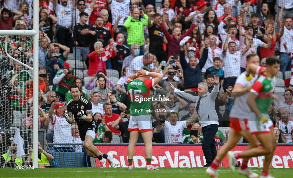 11 September 2021; Tyrone goalkeeper Niall Morgan reacts after Ryan O'Donoghue of Mayo misses a penalty during the GAA Football All-Ireland Senior Championship Final match between Mayo and Tyrone at Croke Park in Dublin. Photo by Stephen McCarthy/Sportsfile