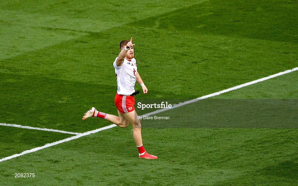 11 September 2021; Cathal McShane of Tyrone celebrates after scoring his side's first goal during the GAA Football All-Ireland Senior Championship Final match between Mayo and Tyrone at Croke Park in Dublin. Photo by Daire Brennan/Sportsfile