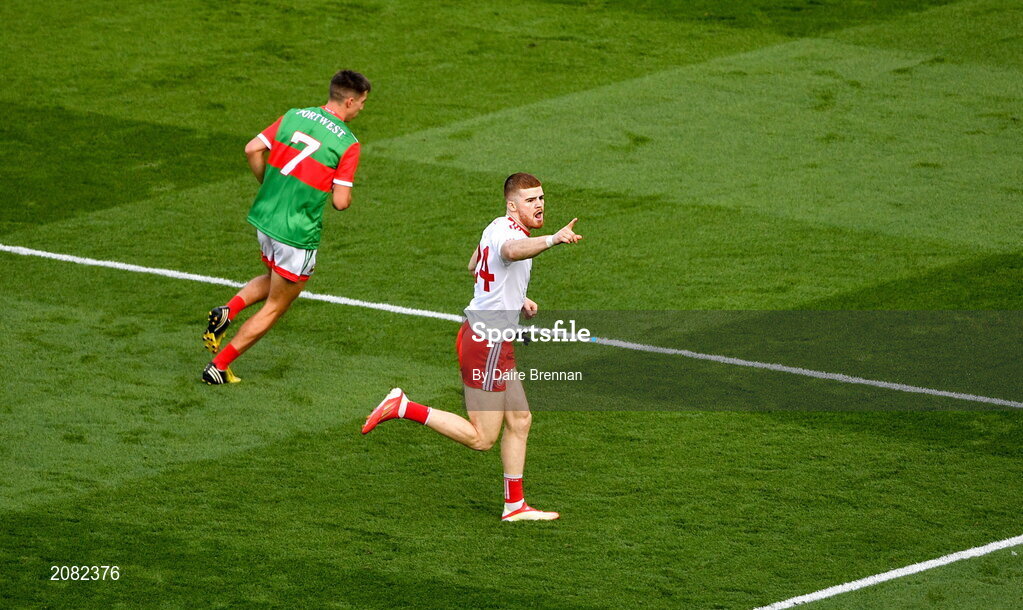 11 September 2021; Cathal McShane of Tyrone celebrates after scoring his side's first goal during the GAA Football All-Ireland Senior Championship Final match between Mayo and Tyrone at Croke Park in Dublin. Photo by Daire Brennan/Sportsfile