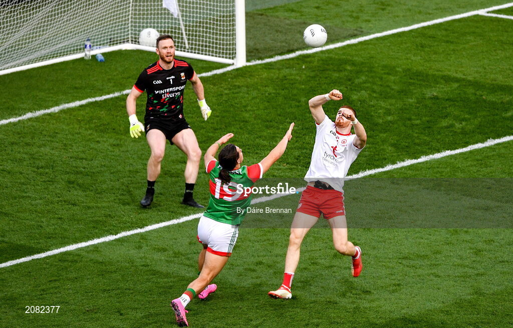 11 September 2021; Cathal McShane of Tyrone scores his side's first goal past Mayo goalkeeper Rob Hennelly during the GAA Football All-Ireland Senior Championship Final match between Mayo and Tyrone at Croke Park in Dublin. Photo by Daire Brennan/Sportsfile