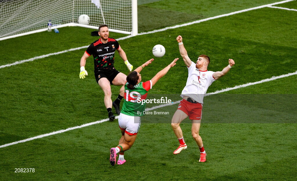 11 September 2021; Cathal McShane of Tyrone scores his side's first goal past Mayo goalkeeper Rob Hennelly during the GAA Football All-Ireland Senior Championship Final match between Mayo and Tyrone at Croke Park in Dublin. Photo by Daire Brennan/Sportsfile