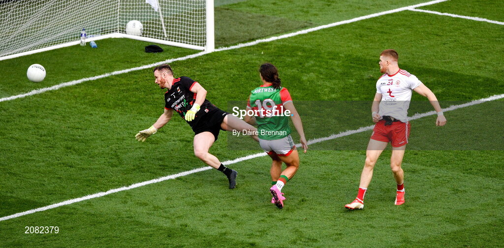 11 September 2021; Cathal McShane of Tyrone scores his side's first goal past Mayo goalkeeper Rob Hennelly during the GAA Football All-Ireland Senior Championship Final match between Mayo and Tyrone at Croke Park in Dublin. Photo by Daire Brennan/Sportsfile