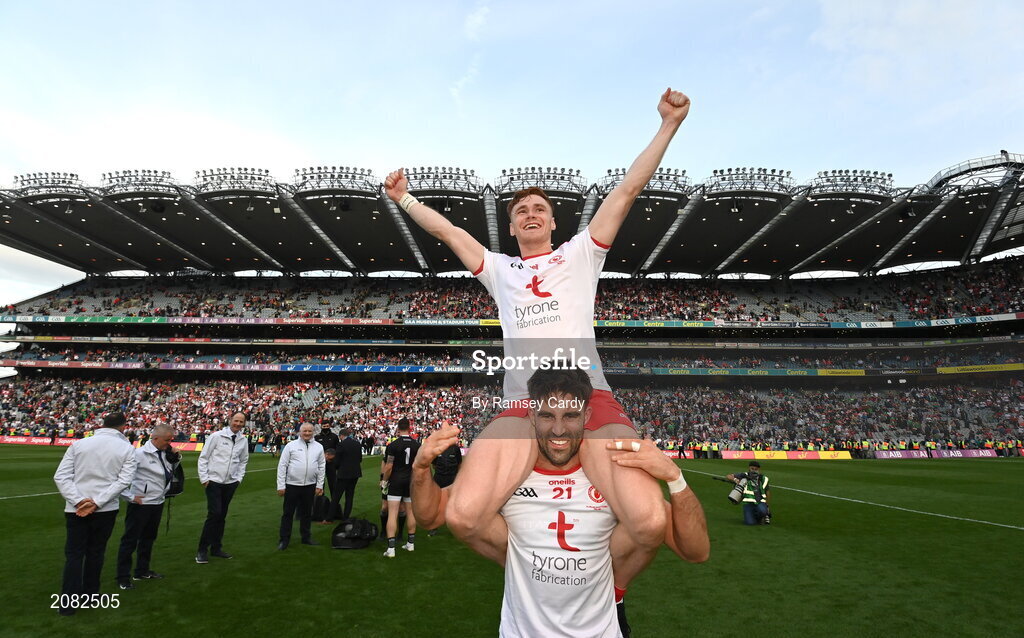 11 September 2021; Tiernan McCann of Tyrone carries team-mate Conor Meyler following victory in the GAA Football All-Ireland Senior Championship Final match between Mayo and Tyrone at Croke Park in Dublin. Photo by Ramsey Cardy/Sportsfile