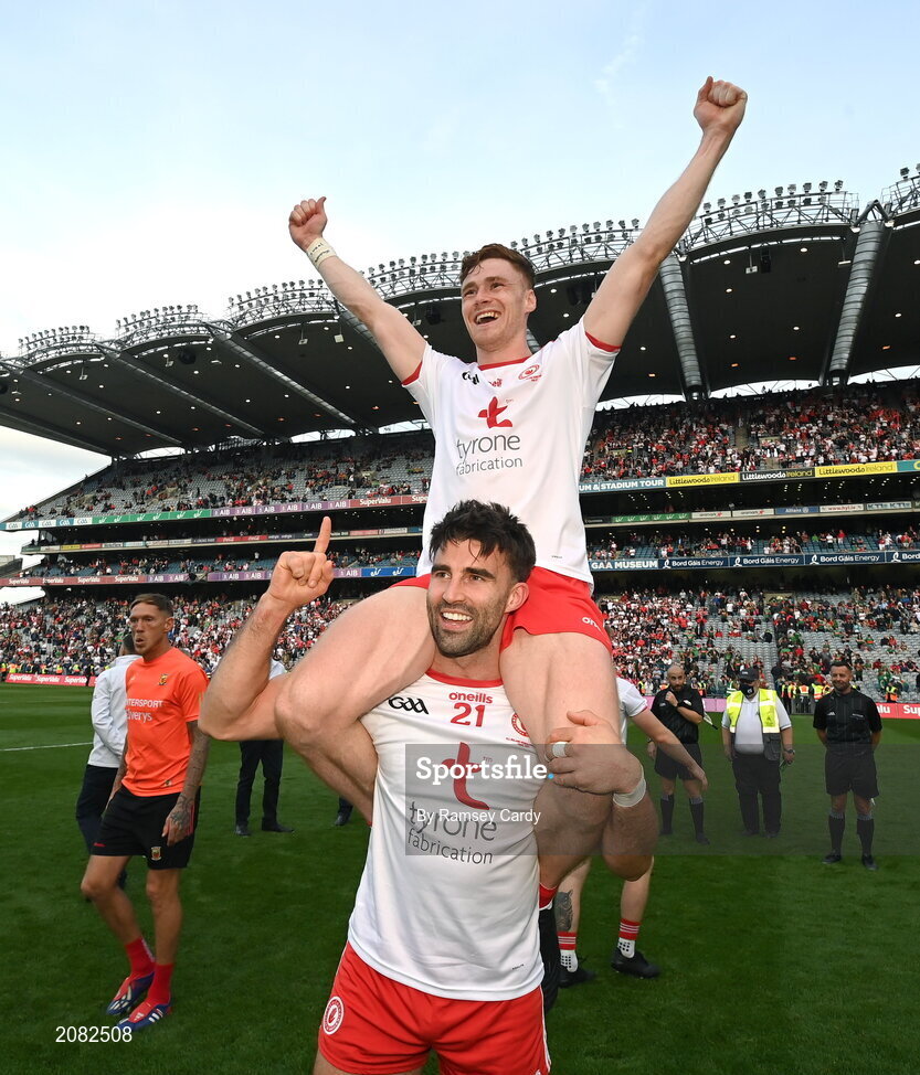 11 September 2021; Tiernan McCann of Tyrone carries team-mate Conor Meyler following victory in the GAA Football All-Ireland Senior Championship Final match between Mayo and Tyrone at Croke Park in Dublin. Photo by Ramsey Cardy/Sportsfile