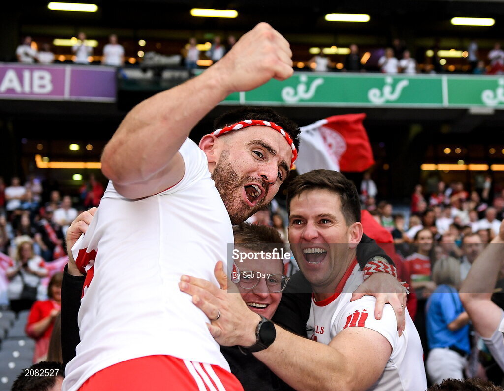 11 September 2021; Pádraig Hampsey of Tyrone celebrates with supporters after his side's victory over Mayo in the GAA Football All-Ireland Senior Championship Final match at Croke Park in Dublin. Photo by Seb Daly/Sportsfile
