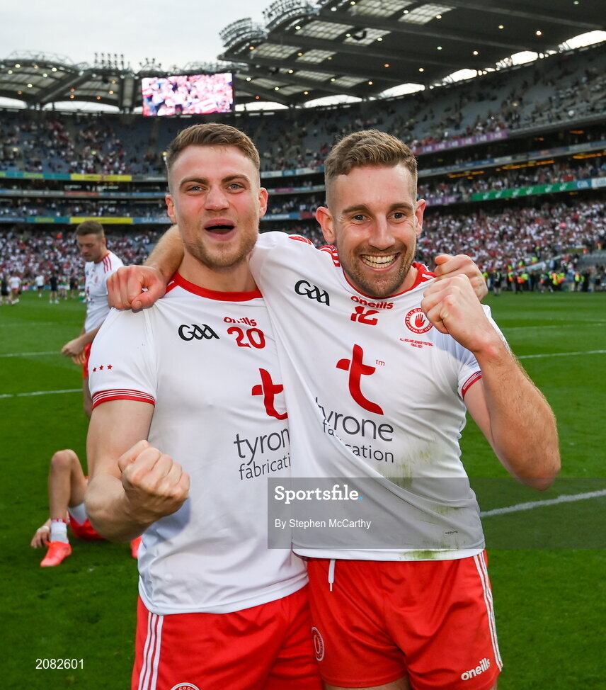 11 September 2021; Niall Kelly, left, and Niall Sludden of Tyrone celebrate after the GAA Football All-Ireland Senior Championship Final match between Mayo and Tyrone at Croke Park in Dublin. Photo by Stephen McCarthy/Sportsfile