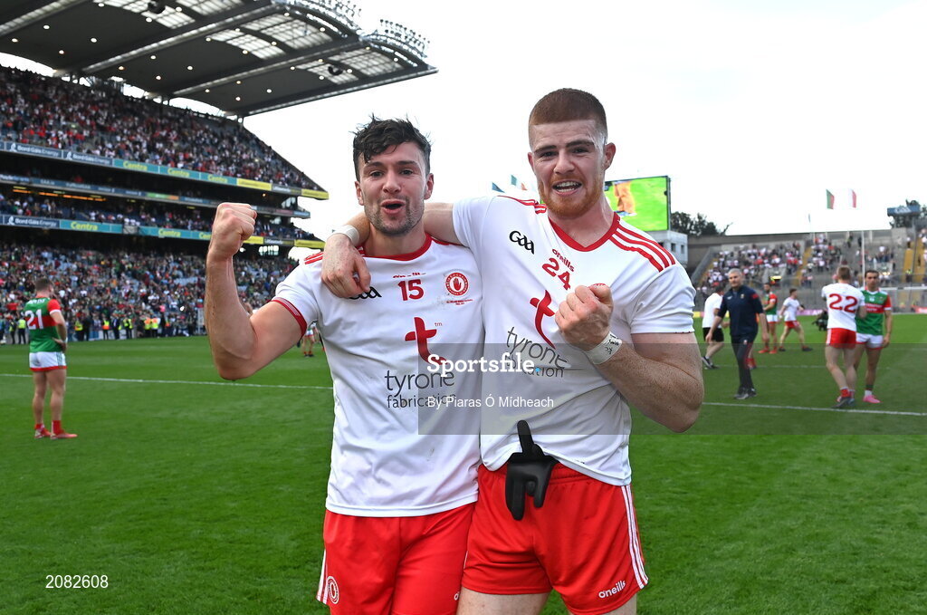 11 September 2021; Conor McKenna, left, and Cathal McShane of Tyrone celebrate after the GAA Football All-Ireland Senior Championship Final match between Mayo and Tyrone at Croke Park in Dublin. Photo by Piaras Ó Mídheach/Sportsfile