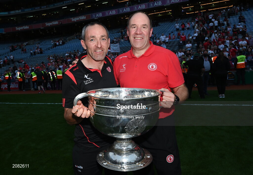 11 September 2021; Tyrone joint-managers Brian Dooher, left, and Feargal Logan celebrate with the Sam Maguire cup after the GAA Football All-Ireland Senior Championship Final match between Mayo and Tyrone at Croke Park in Dublin. Photo by Ramsey Cardy/Sportsfile