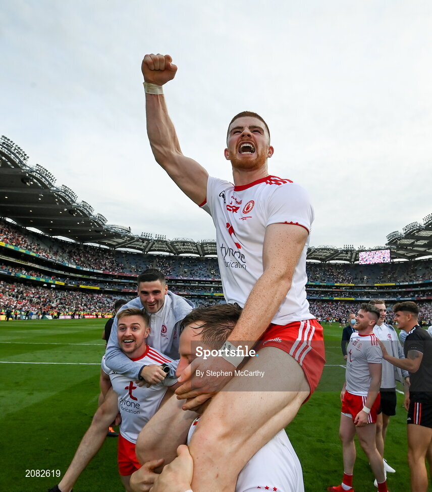 11 September 2021; Cathal McShane of Tyrone celebrates on the shoulders of team-mate Kieran McGeary after the GAA Football All-Ireland Senior Championship Final match between Mayo and Tyrone at Croke Park in Dublin. Photo by Stephen McCarthy/Sportsfile