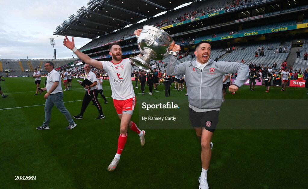 11 September 2021; Ronan McNamee of Tyrone and Ronan O'Neill celebrate with the Sam Maguire Cup after the GAA Football All-Ireland Senior Championship Final match between Mayo and Tyrone at Croke Park in Dublin. Photo by Ramsey Cardy/Sportsfile