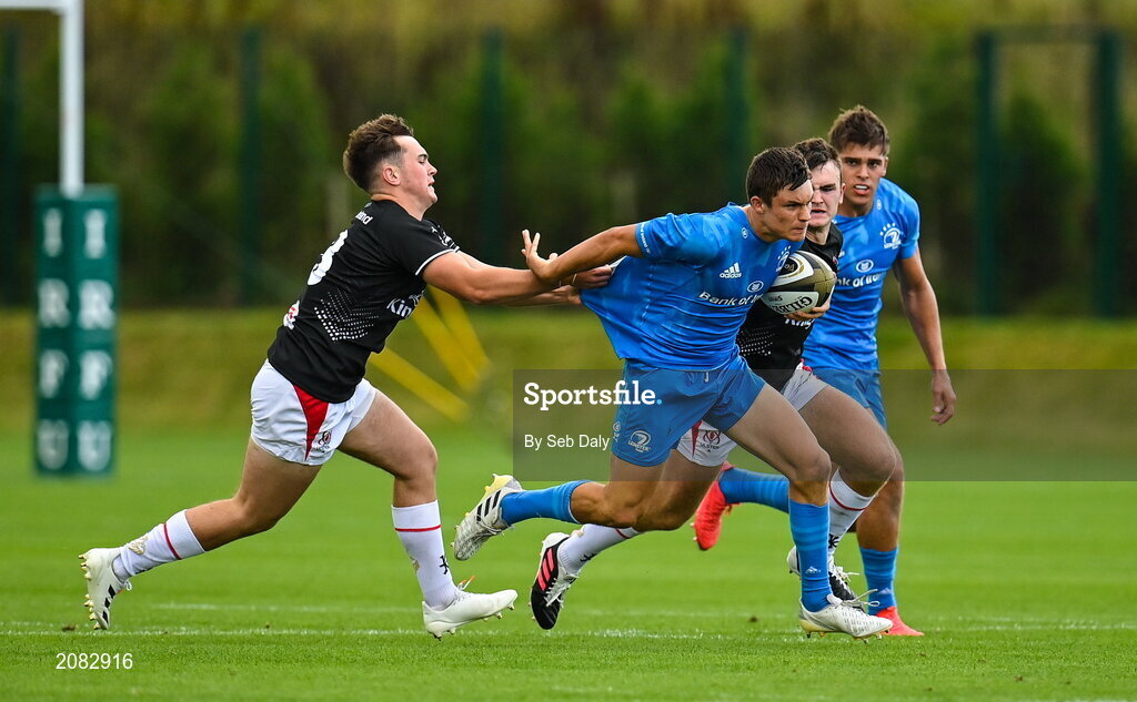 11 September 2021; Dylan O’Grady of Leinster is tackled by Ross Taylor of Ulster during the Development Interprovincial match between Leinster XV and Ulster XV at the IRFU High Performance Centre, on the Sport Ireland Campus in Dublin. Photo by Seb Daly/Sportsfile