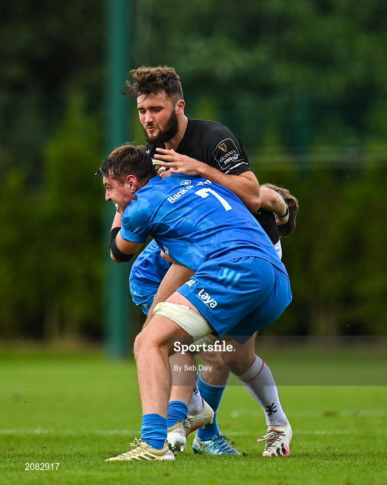 11 September 2021; Ben Carson of Ulster is tackled by Fionn O’Hara, behind, and during the Development Interprovincial match between Leinster XV and Ulster XV at the IRFU High Performance Centre, on the Sport Ireland Campus in Dublin. Photo by Seb Daly/Sportsfile