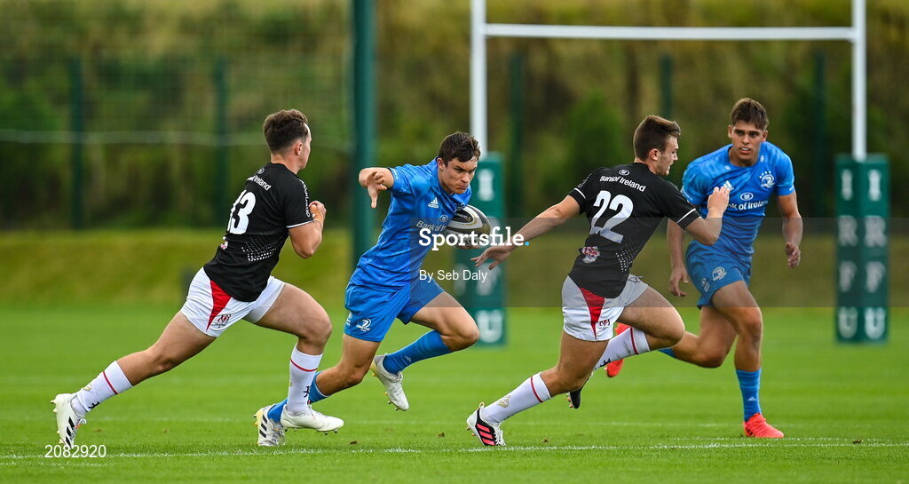 11 September 2021; Dylan O’Grady of Leinster in action against Ross Taylor of Ulster during the Development Interprovincial match between Leinster XV and Ulster XV at the IRFU High Performance Centre, on the Sport Ireland Campus in Dublin. Photo by Seb Daly/Sportsfile