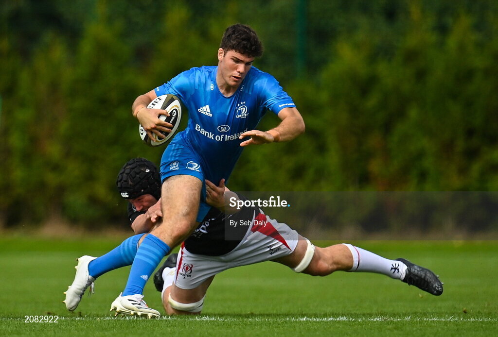 11 September 2021; Ben Brownlee of Leinster is tackled by Charlie Irvine of Ulster during the Development Interprovincial match between Leinster XV and Ulster XV at the IRFU High Performance Centre, on the Sport Ireland Campus in Dublin. Photo by Seb Daly/Sportsfile