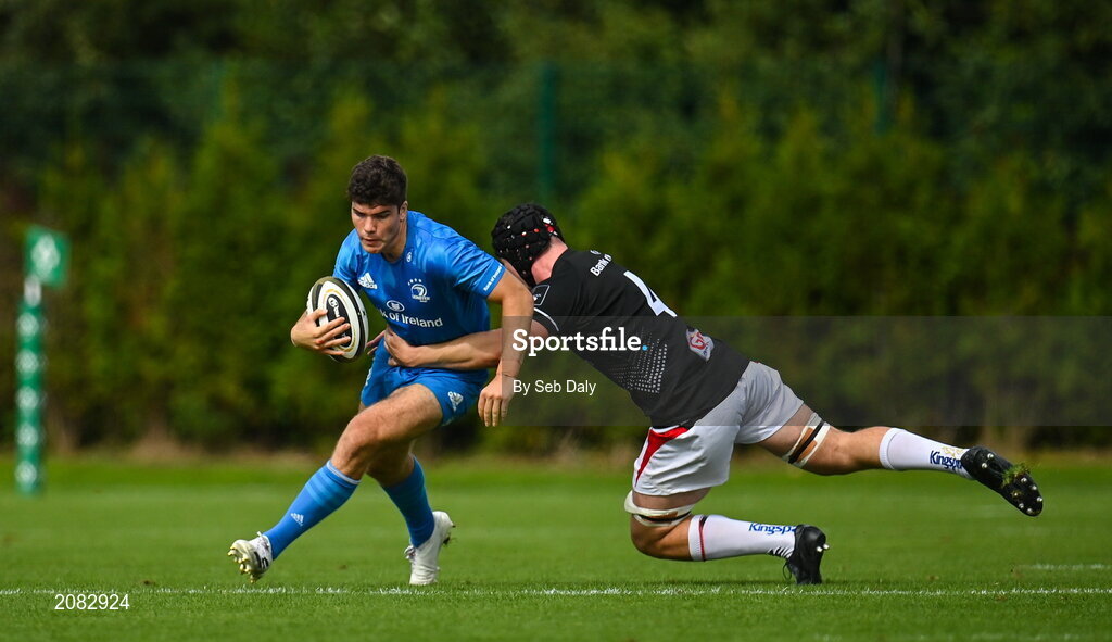11 September 2021; Ben Brownlee of Leinster is tackled by Charlie Irvine of Ulster during the Development Interprovincial match between Leinster XV and Ulster XV at the IRFU High Performance Centre, on the Sport Ireland Campus in Dublin. Photo by Seb Daly/Sportsfile
