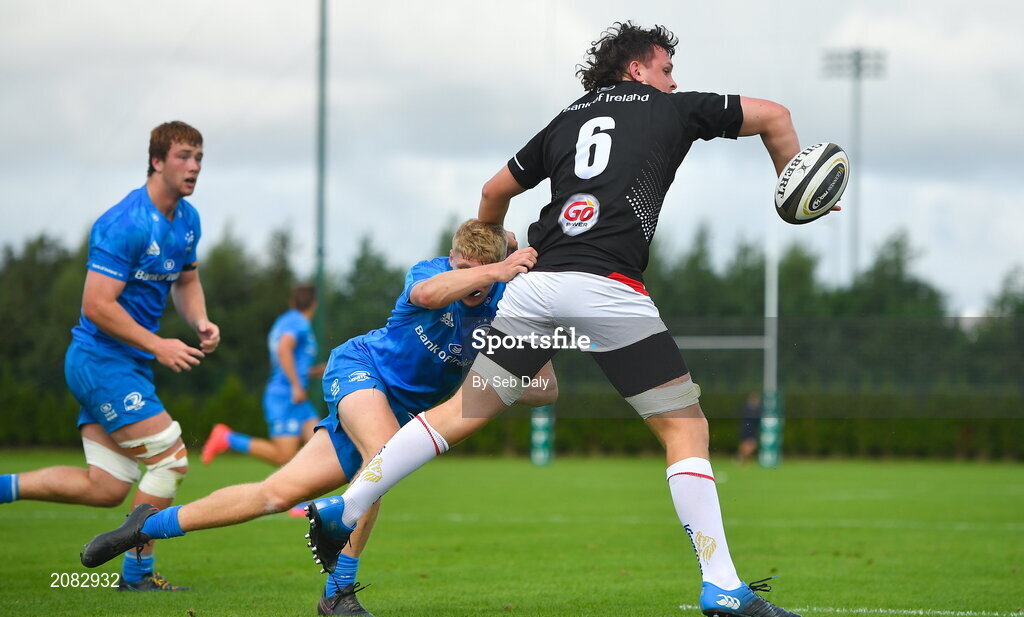 11 September 2021; Lorcan McLoughlin of Ulster in action against Conor Duggan of Leinster during the Development Interprovincial match between Leinster XV and Ulster XV at the IRFU High Performance Centre, on the Sport Ireland Campus in Dublin. Photo by Seb Daly/Sportsfile