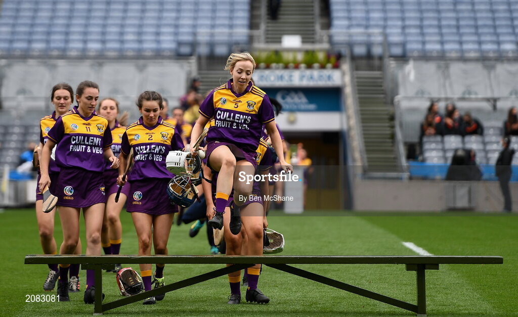 12 September 2021; Ciara Donohoe of Wexford jumps the bench for the team photograph before the All-Ireland Premier Junior Camogie Championship Final match between Armagh and Wexford at Croke Park in Dublin. Photo by Ben McShane/Sportsfile