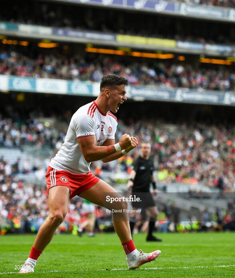 11 September 2021; Michael McKernan of Tyrone celebrates after Mayo kicked a late wide during the GAA Football All-Ireland Senior Championship Final match between Mayo and Tyrone at Croke Park in Dublin. Photo by David Fitzgerald/Sportsfile
