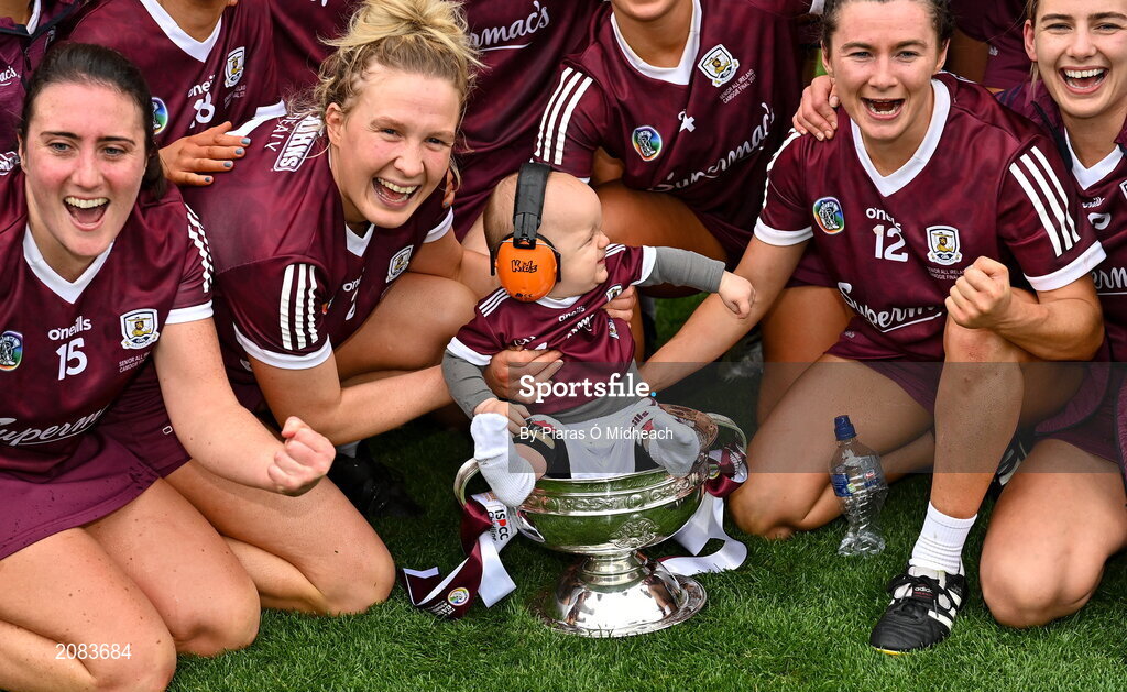12 September 2021; Éanna Kelly, son of Galway physiotherapist Clíodhna Ní Choisdealbha, celebrates in the O'Duffy Cup after the All-Ireland Senior Camogie Championship Final match between Cork and Galway at Croke Park in Dublin. Photo by Piaras Ó Mídheach/Sportsfile