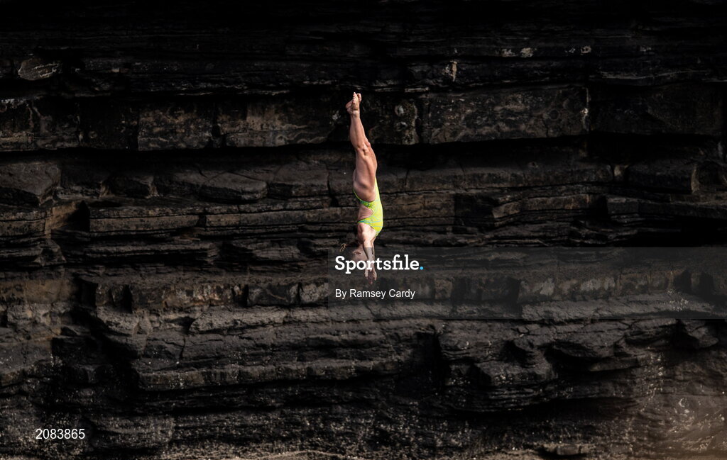 12 September 2021; A competitor dives during round four of the Red Bull Cliff Diving World Series at Downpatrick Head in Mayo. Photo by Ramsey Cardy/Sportsfile