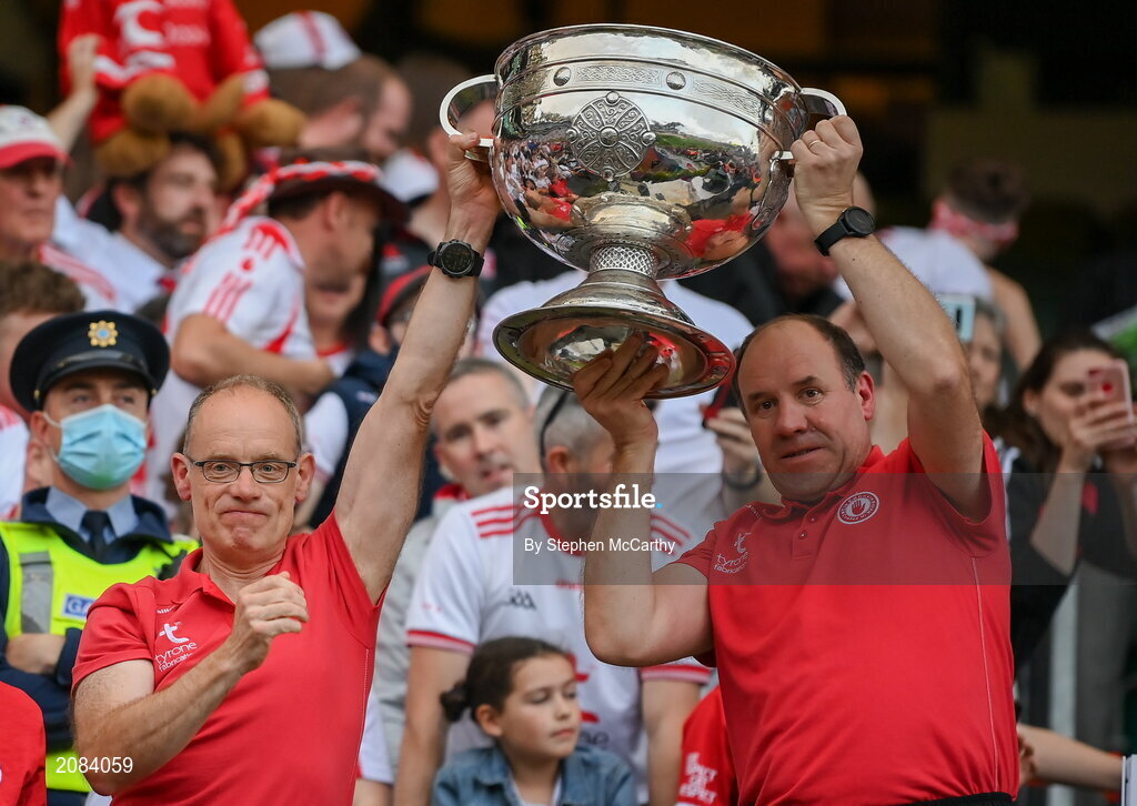 11 September 2021; Tyrone team doctor Michael Logan, left, and Tyrone joint-manager Feargal Logan celebrate with the Sam Maguire Cup following the GAA Football All-Ireland Senior Championship Final match between Mayo and Tyrone at Croke Park in Dublin. Photo by Stephen McCarthy/Sportsfile