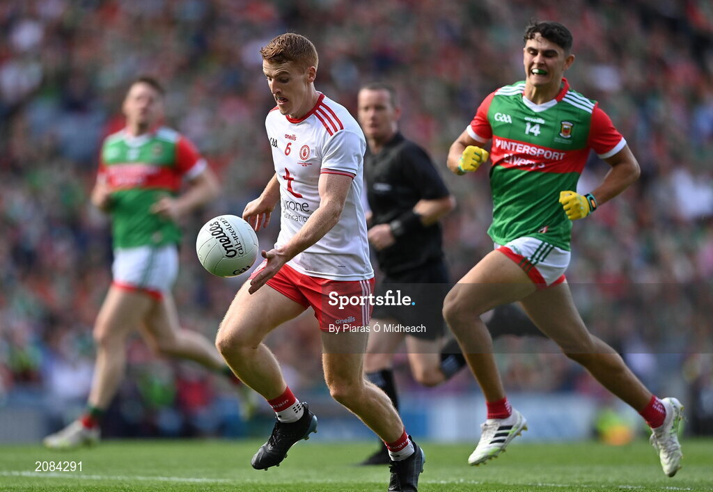 11 September 2021; Peter Harte of Tyrone in action against Tommy Conroy of Mayo during the GAA Football All-Ireland Senior Championship Final match between Mayo and Tyrone at Croke Park in Dublin. Photo by Piaras Ó Mídheach/Sportsfile