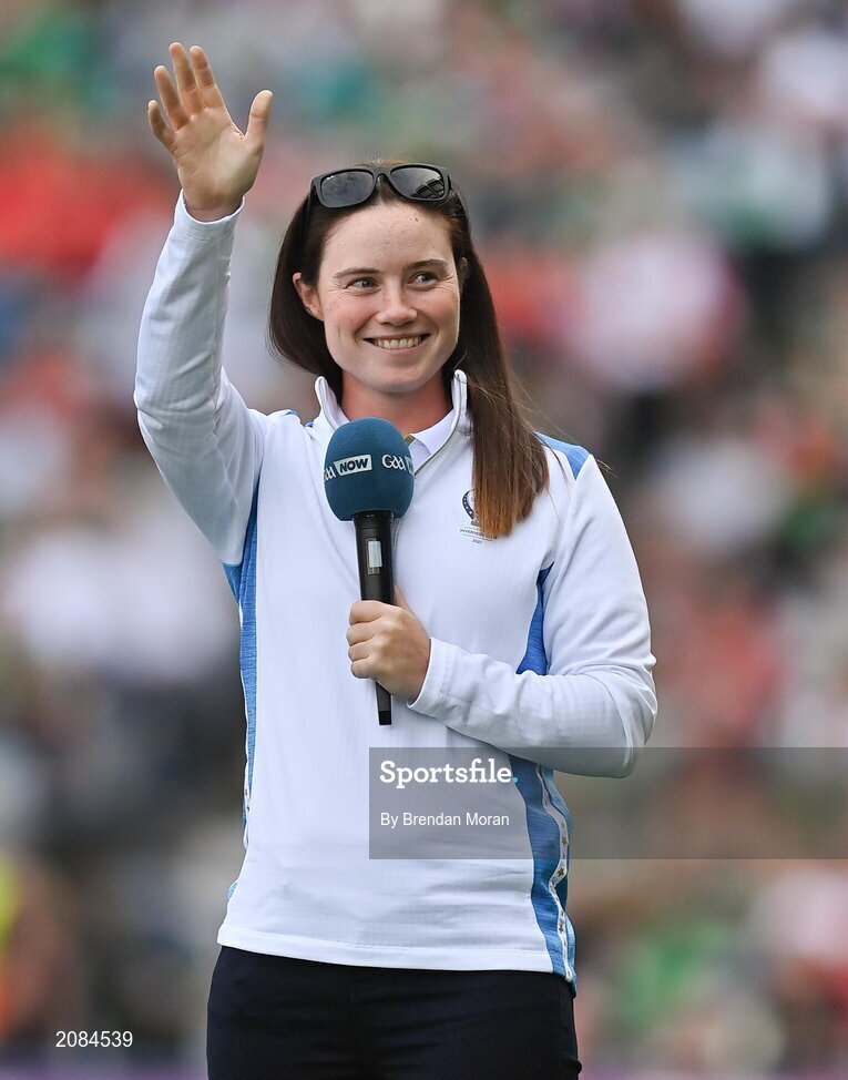 11 September 2021; Solheim Cup winner Leona Maguire is introduced to the crowd at half-time of the GAA Football All-Ireland Senior Championship Final match between Mayo and Tyrone at Croke Park in Dublin. Photo by Brendan Moran/Sportsfile