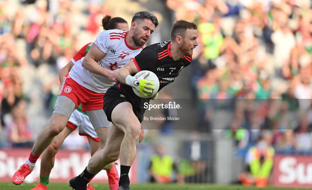 11 September 2021; Mayo goalkeeper Rob Hennelly in action against Matthew Donnelly of Tyrone during the GAA Football All-Ireland Senior Championship Final match between Mayo and Tyrone at Croke Park in Dublin. Photo by Brendan Moran/Sportsfile