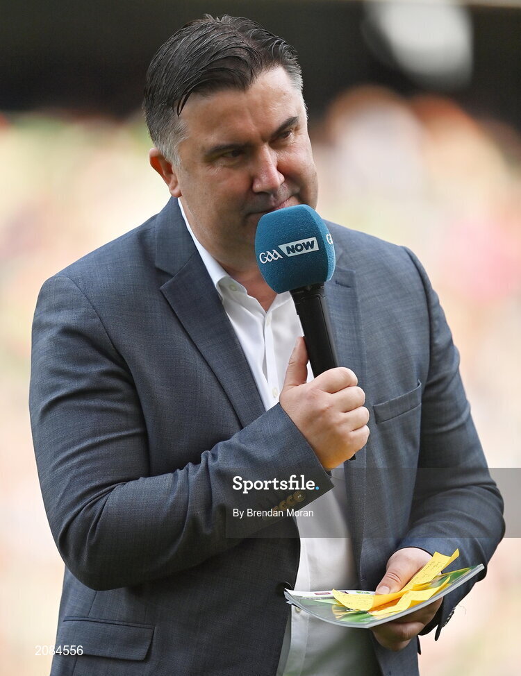 11 September 2021; MC Paul Collins interviews Paralympic gold medallist Ellen Keane and Solheim Cup winner Leona Maguire at half-time in the GAA Football All-Ireland Senior Championship Final match between Mayo and Tyrone at Croke Park in Dublin. Photo by Brendan Moran/Sportsfile
