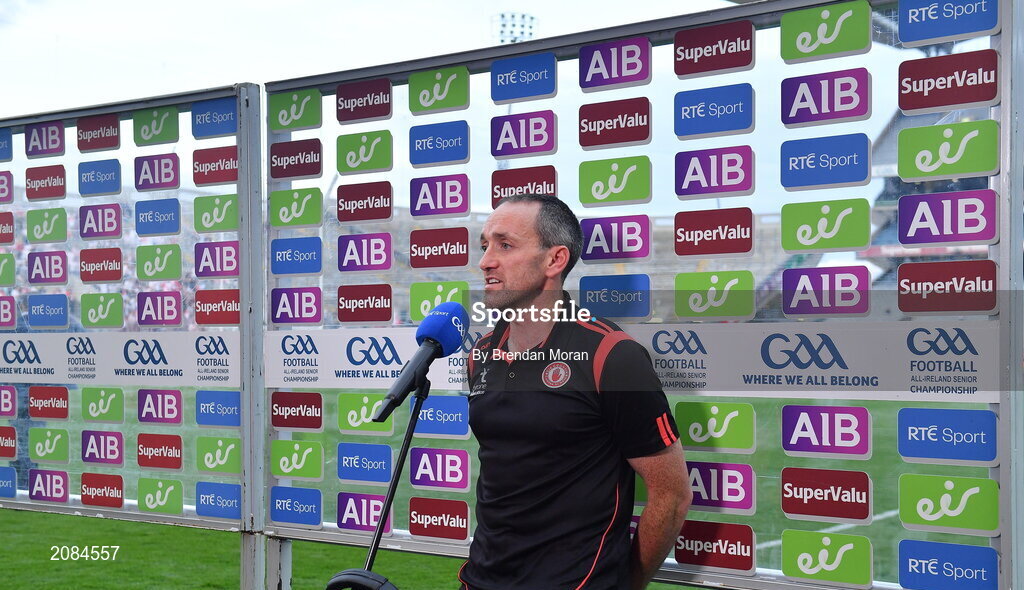 11 September 2021; Tyrone joint-manager Brian Dooher is interviewed by TV after the GAA Football All-Ireland Senior Championship Final match between Mayo and Tyrone at Croke Park in Dublin. Photo by Brendan Moran/Sportsfile