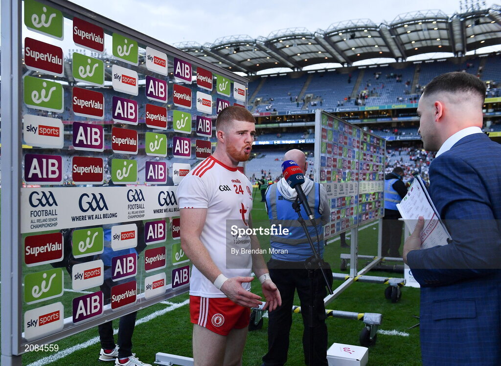 11 September 2021; Cathal McShane of Tyrone is interviewed by TV after the GAA Football All-Ireland Senior Championship Final match between Mayo and Tyrone at Croke Park in Dublin. Photo by Brendan Moran/Sportsfile