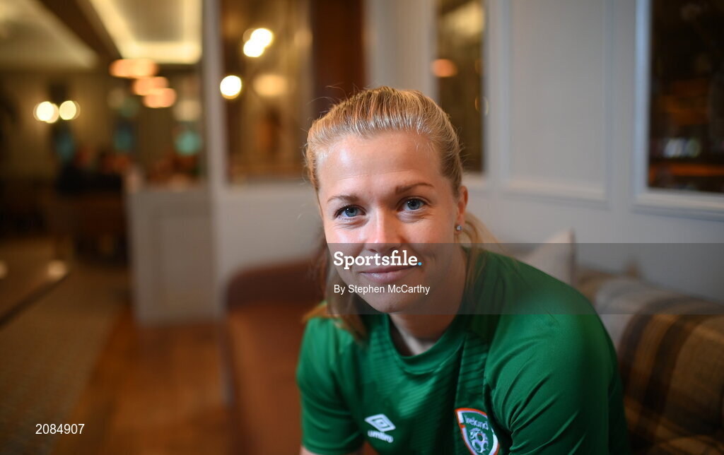 15 September 2021; Ruesha Littlejohn poses for a portrait during a Republic of Ireland press conference at the Castleknock Hotel in Dublin. Photo by Stephen McCarthy/Sportsfile