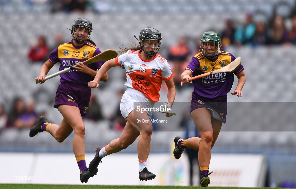 12 September 2021; Ciara Donnelly of Armagh and Megan Cullen, left, and Roisin Cooney of Wexford during the All-Ireland Premier Junior Camogie Championship Final match between Armagh and Wexford at Croke Park in Dublin. Photo by Ben McShane/Sportsfile