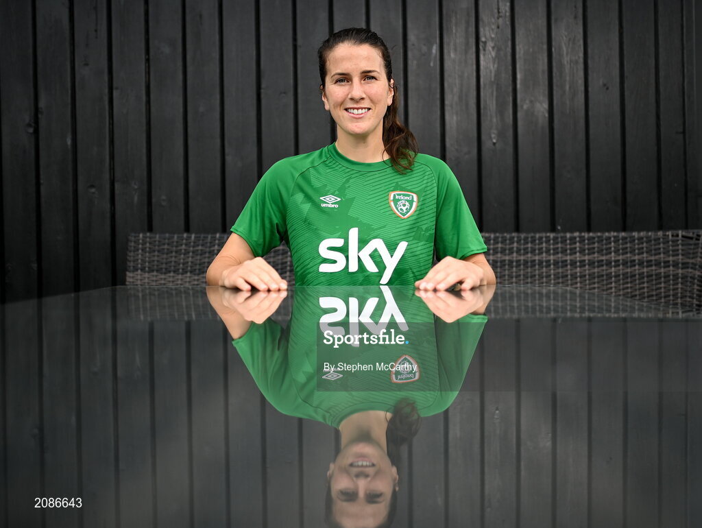 17 September 2021; Niamh Fahey poses for a portrait during a Republic of Ireland press conference at the Castleknock Hotel in Dublin. Photo by Stephen McCarthy/Sportsfile