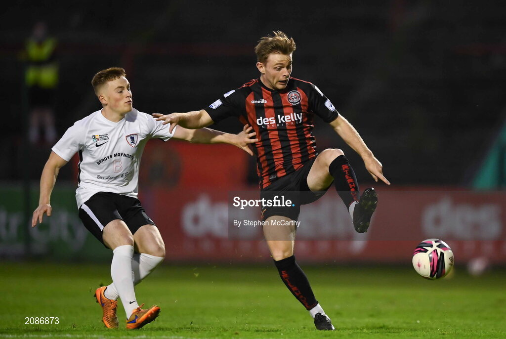 17 September 2021; Conor Levingston of Bohemians in action against Paddy O'Sullivan of Maynooth University Town during the extra.ie FAI Cup Quarter-Final match between Bohemians and Maynooth University Town at Dalymount Park in Dublin. Photo by Stephen McCarthy/Sportsfile