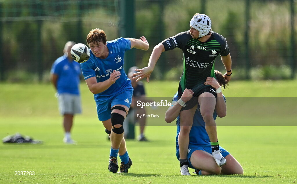 18 September 2021; Mack Hansen of Connacht off-loads as he is tackled by Michael McCormack of Leinster during the Development Interprovincial match between Leinster XV and Connacht XV at the IRFU High Performance Centre, on the Sport Ireland Campus in Dublin. Photo by Seb Daly/Sportsfile