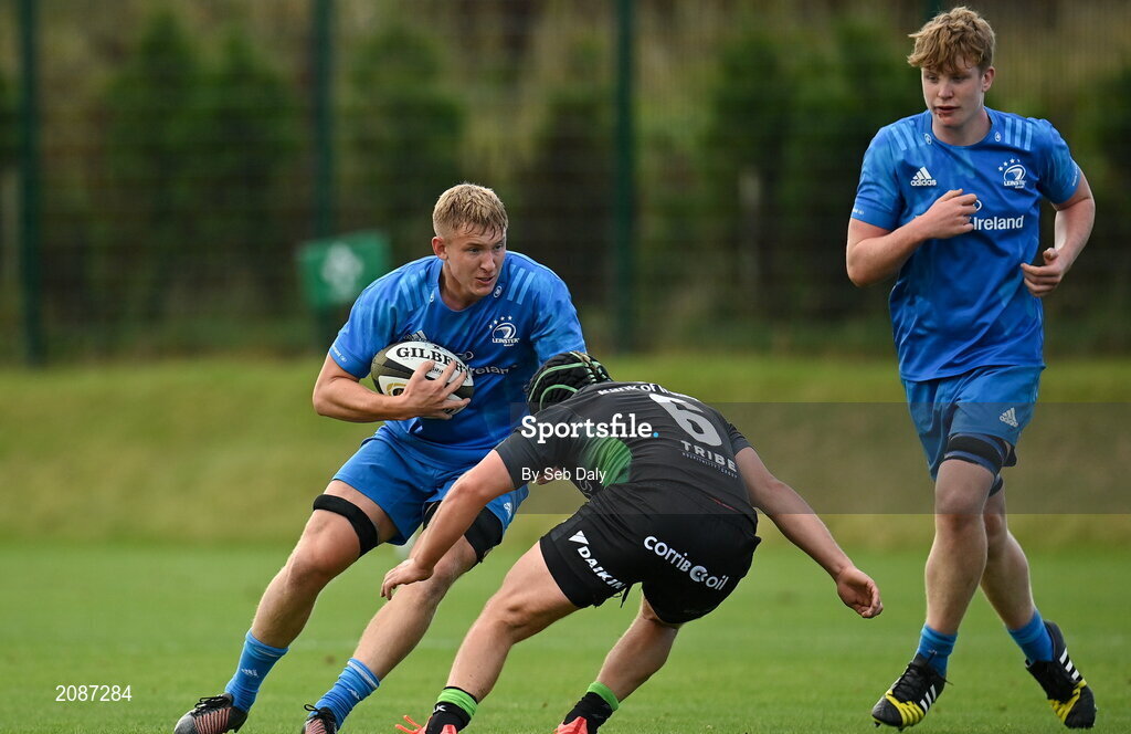 18 September 2021; Fionn McWey of Leinster in action against Jonny Murphy of Connacht during the Development Interprovincial match between Leinster XV and Connacht XV at the IRFU High Performance Centre, on the Sport Ireland Campus in Dublin. Photo by Seb Daly/Sportsfile