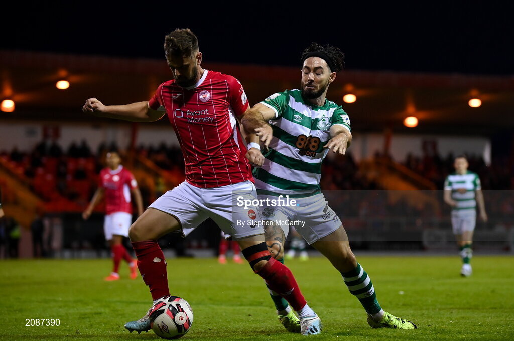 18 September 2021; Greg Bolger of Sligo Rovers in action against Richie Towell of Shamrock Rovers during the SSE Airtricity League Premier Division match between Sligo Rovers and Shamrock Rovers at The Showgrounds in Sligo. Photo by Stephen McCarthy/Sportsfile