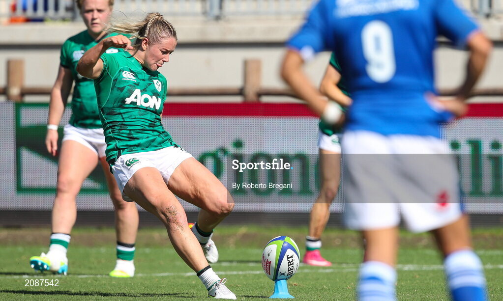 19 September 2021; Stacey Flood of Ireland kicks a penalty during the Rugby World Cup 2022 Europe Qualifying Tournament match between Italy and Ireland at Stadio Sergio Lanfranchi in Parma, Italy. Photo by Roberto Bregani/Sportsfile