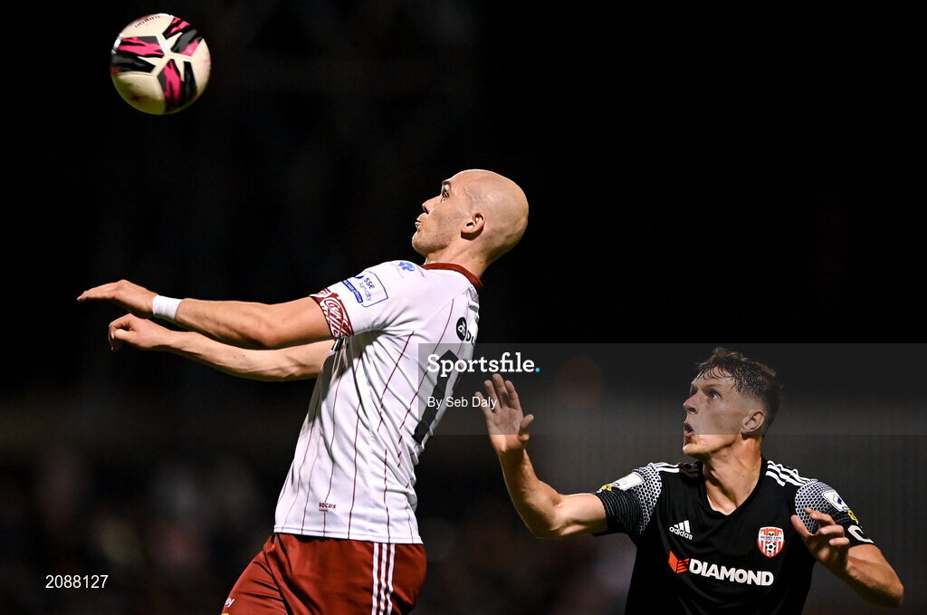 20 September 2021; Georgie Kelly of Bohemians in action against Eoin Toal of Derry City during the SSE Airtricity League Premier Division match between Bohemians and Derry City at Dalymount Park in Dublin. Photo by Seb Daly/Sportsfile
