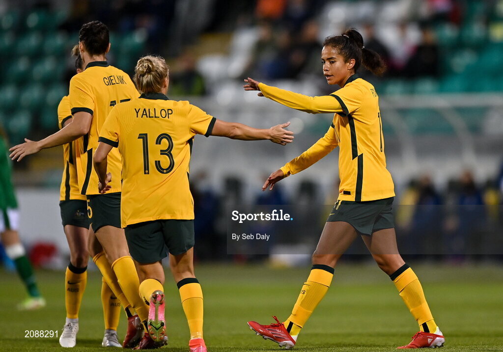 21 September 2021; Mary Fowler of Australia, right, is congratulated by team-mates after scoring their side's first goal during the women's international friendly match between Republic of Ireland and Australia at Tallaght Stadium in Dublin. Photo by Seb Daly/Sportsfile